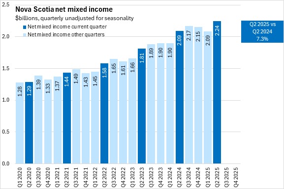 Nova Scotia's net mixed income from unincorporated businesses grew 7.3% from Q2 2024 to Q2 2025, slower than the national average pace of 7.8%. Manitoba reported the fastest growth in net mixed income (slowest: Newfoundland and Labrador). Saskatchewan reported negative net mixed income in Q2, as it has in this quarter for the last four years.