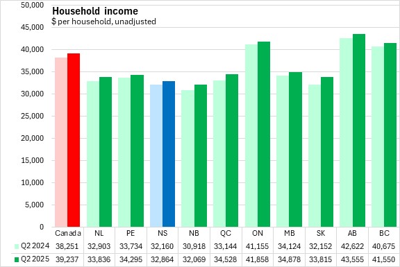 In Q2 2025, Nova Scotia's household income was $32,864 per household or 83.8% of the national average ($39,237). The highest income per household was in Alberta and lowest in New Brunswick (followed by Nova Scotia).