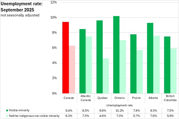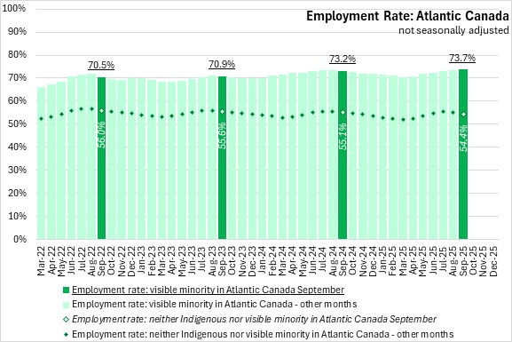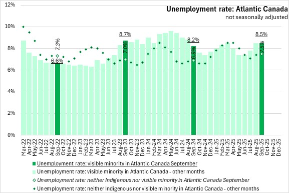 In September 2025, the unemployment rate for the visible minority population was higher compared to the population that was neither Indigenous nor in a visible minority population in Atlantic Canada for the third consecutive month.