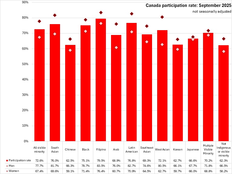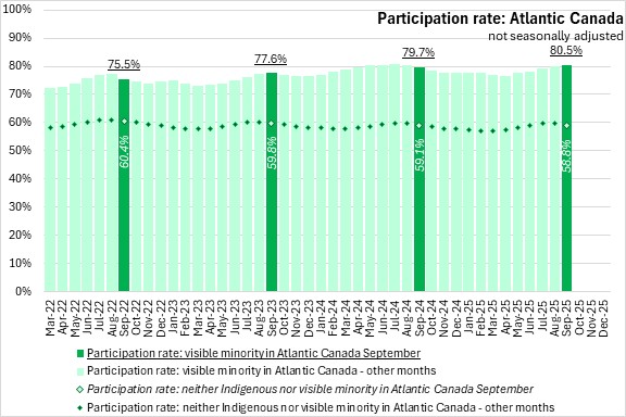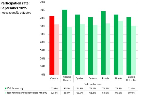 National participation rates were higher for those who identify with a visible minority population (72.6%) than for those that did not identify as Indigenous or in a visible minority population (62.3%). Participation rates of those who identify with a visible minority population were higher in all regions in September 2025. In Atlantic Canada, those who identify with a visible minority population reported a 80.5% participation rate, compared to a 58.8% participation rate for those that do not identify as Indigenous or in a visible minority population, the largest gap among regions.