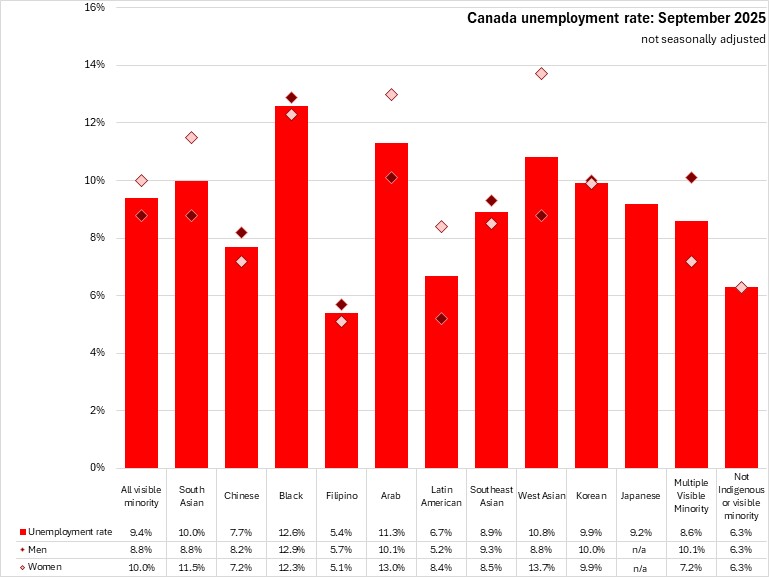 In September 2025, the unemployment rates of males in all visible minority populations were lower (8.8%) than for females in visible minority populations (10.0%), which was not the case for populations that did not identify as Indigenous or visible minorities. Among specific populations, female unemployment rates were lower than males among Chinese, Black, Filipino, South East Asian, and Korean as well as for those that identified with multiple visible minority populations.
