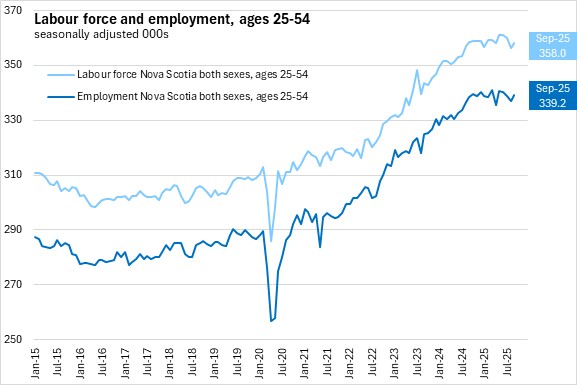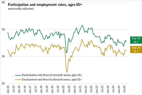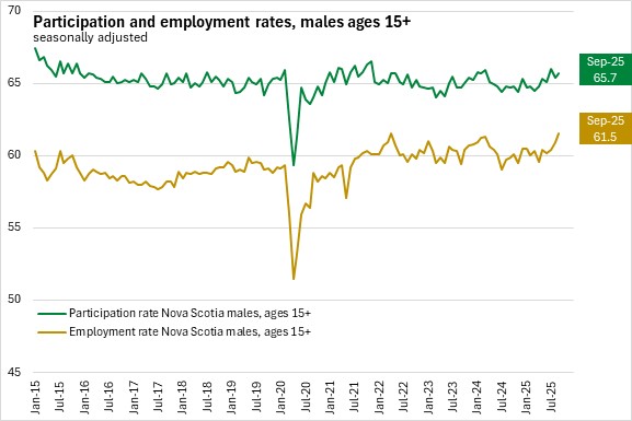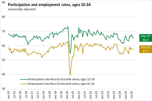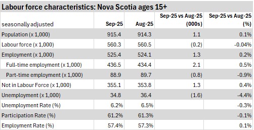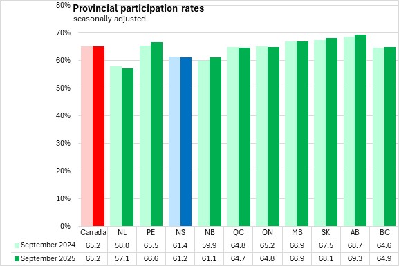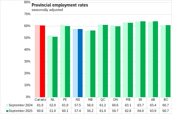 Nova Scotia's labour force participation rate edged down 0.1 percentage point to 61.2% while the employment rate edged up 0.1 percentage point to 57.4% in September 2025.