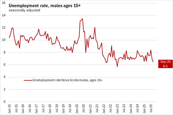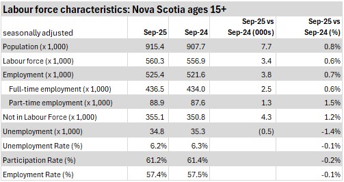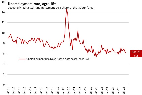 With employment rising and labour force contracting, Nova Scotia's unemployment rate decreased 0.3 percentage points to 6.2% in September 2025.