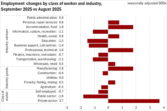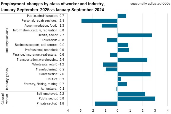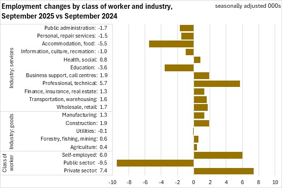 Compared to September 2024, there were employment gains for private sector workers (+7,400, +2.3%), and self-employment (+6,000, +12.1%), while public sector employment declined (-9,500, -6.5%).