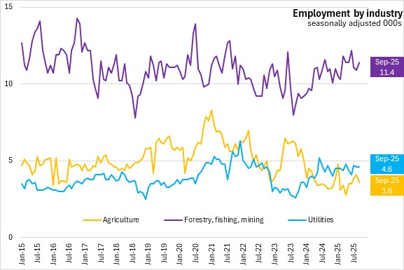 Among youth (ages 15-24), employment fell by 200 (-0.3%) while the labour force fell by 600 (-0.8%). As labour force fell faster than employment, the youth unemployment rate declined 0.4 percentage points to 12.7% in September 2025. The youth participation rate declined 0.6 percentage points to 65.4% while the youth employment rate decreased 0.3 percentage point to 57.1%.