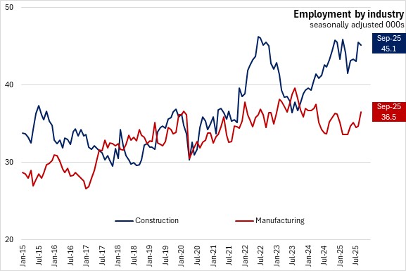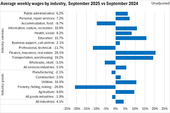 Average weekly earnings increased by 4.1% from September 2024 to September 2025. The fastest gains in average weekly earnings were in finance/insurance/real estate, transportation/warehousing, and education. The largest declines in average weekly wages were in forestry/fishing/mining, followed by professional/technical services.