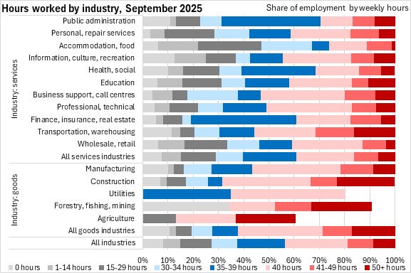 Compared to the provincial average, a larger share of workers in goods producing industries, transportation/warehousing, and business support/call centres worked more than 40 hours per week in September 2025.