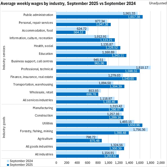Average weekly earnings across all employees were $1,202.62 in September 2025. The highest average weekly earnings (both full and part time employees) were reported in public administration, utilities, and professional/technical services. The lowest average weekly earnings were in accommodation/food services, wholesale/retail and agriculture.
