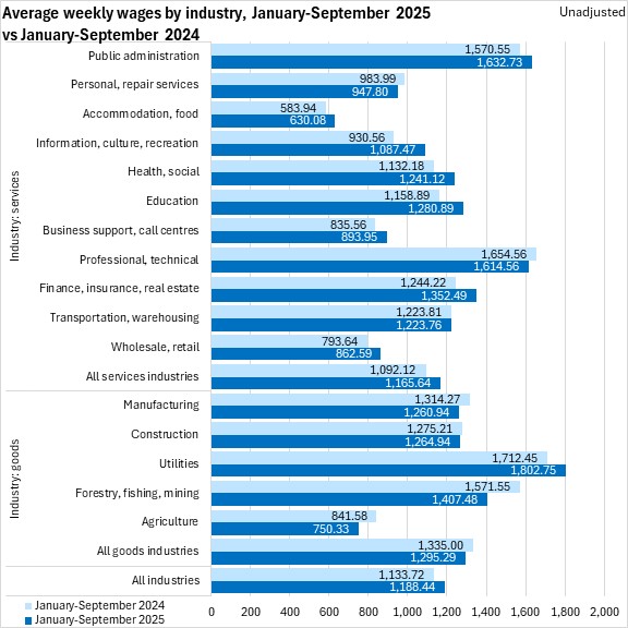Average weekly earnings in the first nine months of 2025 were highest in utilities, public administration, and professional/technical services. The lowest average weekly earnings were in accommodation/food services, and agriculture in January-September 2025.
