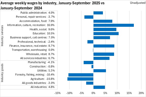 Average weekly earnings increased 4.8% in the first nine months of 2025 compared to the same period of 2024. The fastest gains in average weekly earnings were in information/culture/recreation, education, and health care/social assistance. Agriculture and forestry/fishing/mining reported the fastest declines in average weekly earnings in January-September 2025.