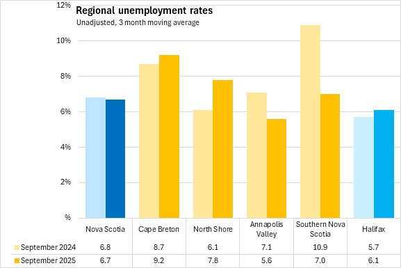 Unemployment rates declined in Annapolis Valley and Southern Nova Scotia compared to September 2024. The unemployment rates in Cape Breton, North Shore and Halifax rose compared to one year ago.