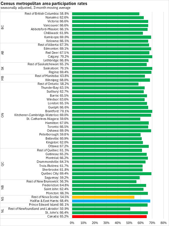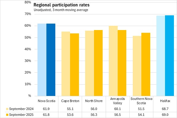 Halifax & East Hant's participation rate was 68.4% in the seasonally adjusted September 2025 three month moving average, while participation rates were 54.5% across the rest of the province.