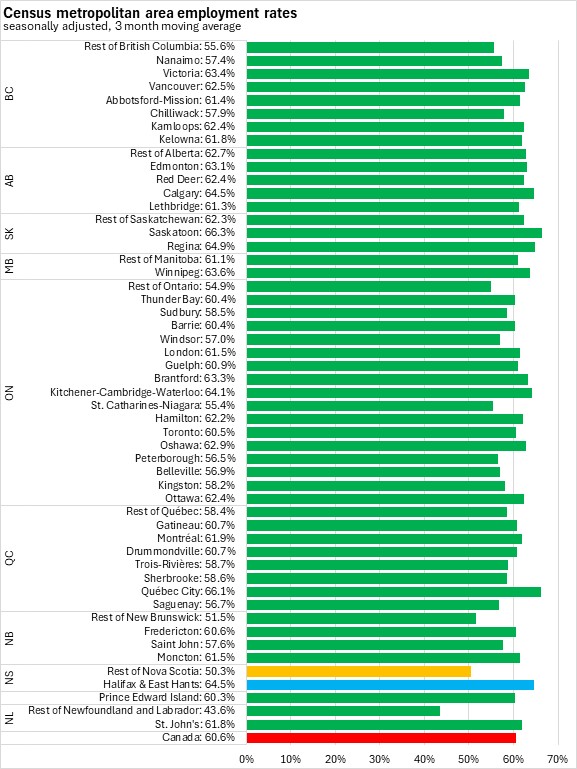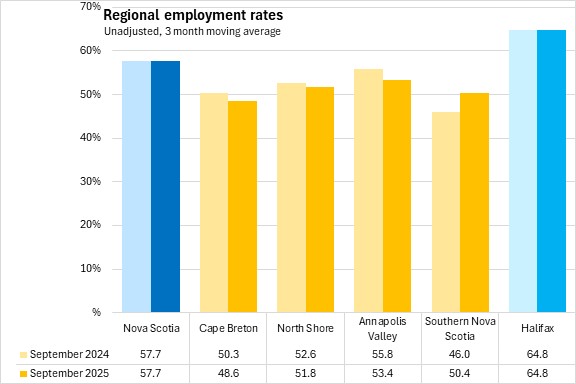 Halifax & East Hants reported an employment rate of 64.5% in the seasonally adjusted September 2025 three month moving average, while the employment rate was 50.3% outside the city.