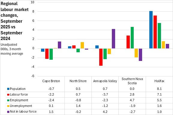 Compared with September 2024, labour force and employment growth was concentrated in Halifax and Southern Nova Scotia. Southern Nova Scotia reported employment growth that outpaced labour force growth, with fewer persons among the unemployed and not in the labour force. North Shore region reported a larger labour force but a decline in employment compared to one year ago, translating into higher unemployment. Cape Breton reported lower population, labour force and employment, with a marginal increase in unemployment and a rise in those not in the labour force. The Annapolis Valley region reported declines in labour force that outpaced employment decline and a notable rise in those not in the labour force.
