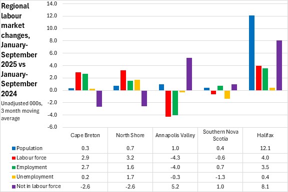 Compared with January-September 2024, labour force and employment increases were concentrated in Cape Breton, the North Shore, and Halifax, all of which reported stronger growth in labour force than employment, resulting in higher unemployment. Lower labour force and employment in the Annapolis Valley resulted in more people not in the labour force. Southern Nova Scotia reported a higher employment on a smaller labour force, resulting in fewer unemployed and a higher number of persons not in the labour force. Halifax saw the strongest population growth, and a large increase in the number of people not in the labour force.