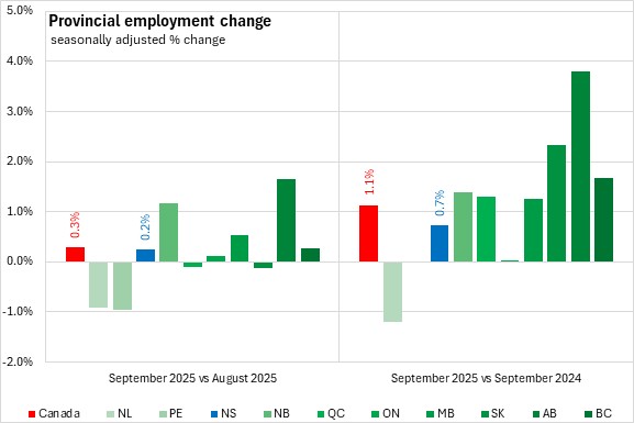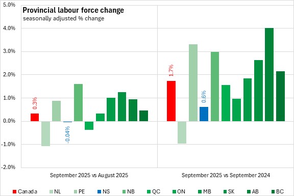 Canada's labour force was up 0.3% from August with seven provinces reporting growth in September 2025. The fastest growth was in New Brunswick, while the fastest decline was in Newfoundland and Labrador.