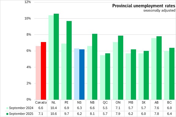 The national unemployment rate was 7.1% in September 2025, up from 6.6% in September 2024. Québec had the lowest unemployment rate while Newfoundland and Labrador reported the highest unemployment rate in September 2025.