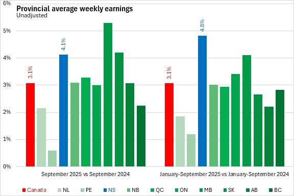 Comparing January-September 2025 with the same months in 2024, Nova Scotia's average weekly earnings were up 4.8% - fastest among provinces. National average weekly earnings were up 3.1% year-to-date with the slowest growth in Prince Edward Island.