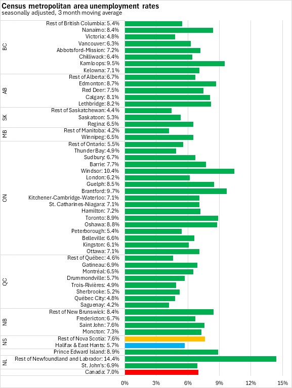 The Halifax & East Hants unemployment rate was 5.7% in the seasonally adjusted September 2025 three month moving average. Outside of Halifax & East Hants the unemployment rate was 7.6%. In central and western provinces, unemployment rates in Census Metropolitan Areas are similar to or higher than unemployment rates outside CMAs. In the Atlantic Provinces unemployment rates are typically higher outside CMAs.