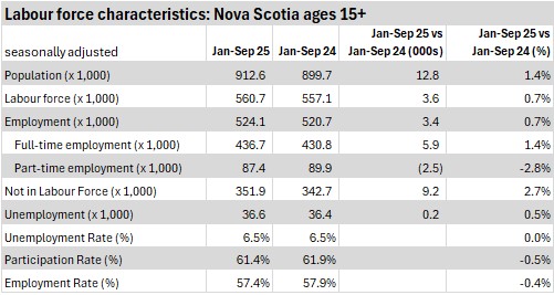 Compared with the first nine months of 2024, Nova Scotia's population over the age of 15 increased by 12,800 (+1.4%), while the labour force grew by 3,600 (+0.7%), and employment increased by 3,400 (+0.7%). The unemployment rate was unchanged, while the participation rate fell by 0.5 percentage points and the employment rate declined by 0.4 percentage points.