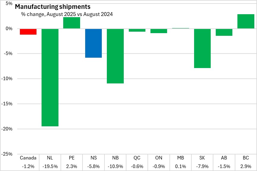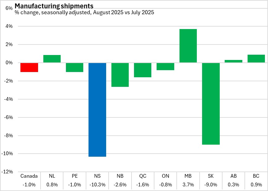 Nova Scotia's manufacturing shipments decreased by 5.8% year-over-year. National shipments decreased 1.0% with declines in all provinces except British Columbia, Prince Edward Island, and Manitoba. Newfoundland and Labrador reported the steepest decline.