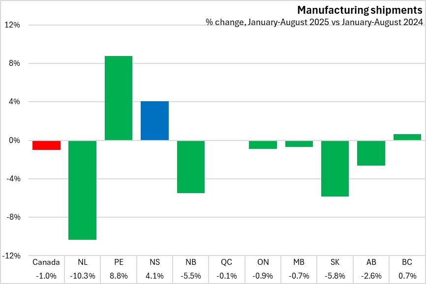 Nova Scotia's manufacturing shipments increased by 4.1% compared to the same period in 2024. National shipments decreased 1.0%. Seven provinces reported decreases, led by Newfoundland and Labrador. Prince Edward Island and Nova Scotia reported the strongest gains.