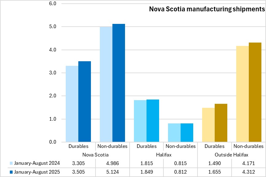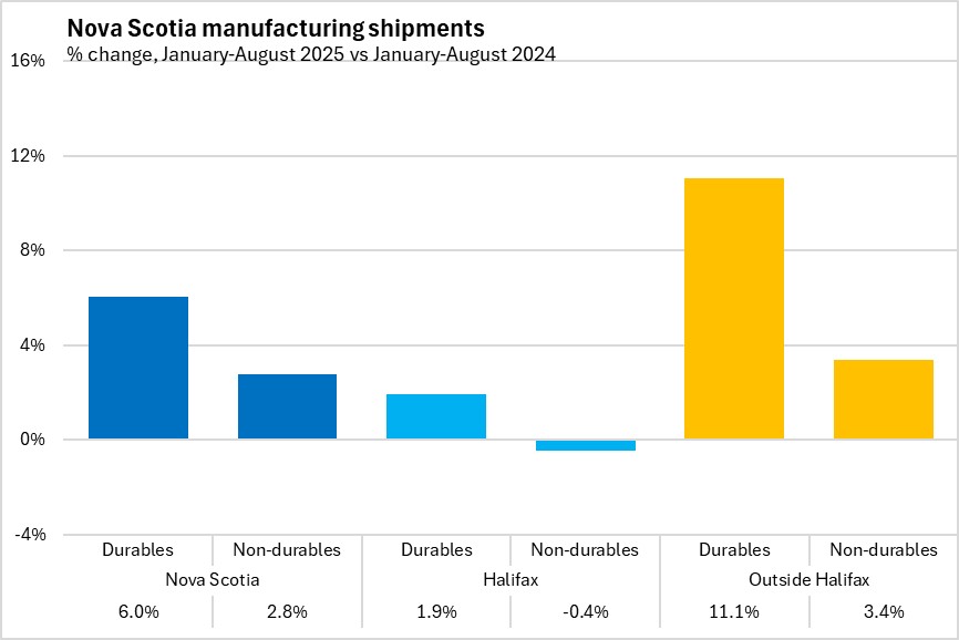 Nova Scotia's year-to-date durable goods shipments increased 6.0%, while non-durable goods shipments increased 2.8% in the same period. In Halifax, durable goods shipments increased 1.9% and non-durables declined 0.4%, year-to-date. Outside Halifax, durables rose 11.1% while non-durables increased 3.4%.