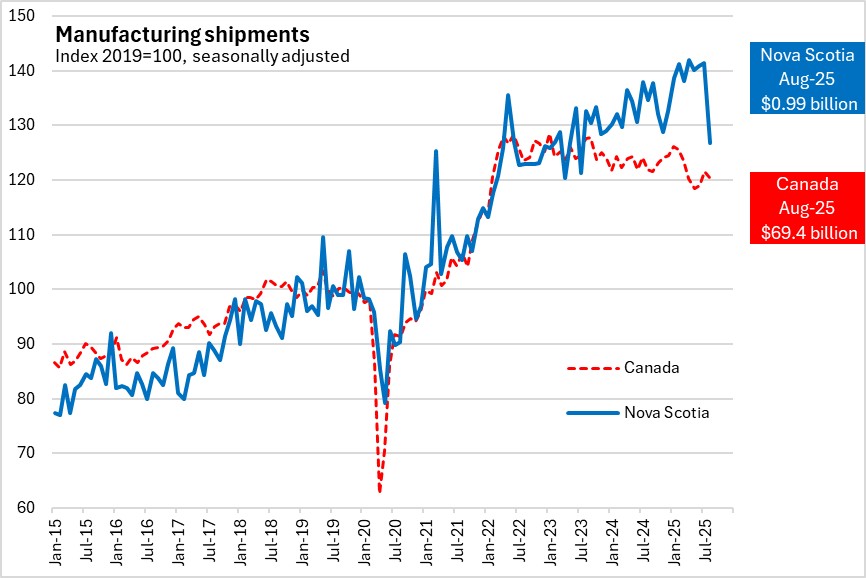 Periodic spikes in Nova Scotia's shipments values are not uncommon. Throughout 2024, manufacturing shipments were stable, with volatility at both the national and provincial levels. In 2025, Nova Scotia's shipments have reversed course and have sharply declined in August while national shipments continued to trend down.