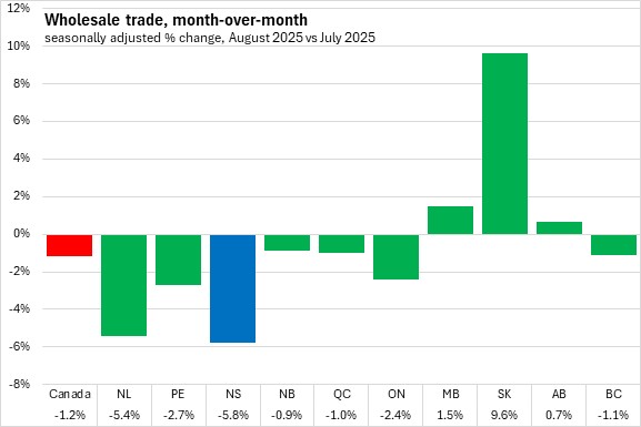 Nova Scotia wholesale trade decreased 5.8% to $1.219 billion. National wholesale trade decreased 1.2% to $85.4 billion. Seven of ten provinces reported declines in August, led by Nova Scotia. Saskatchewan reported the fastest increase.