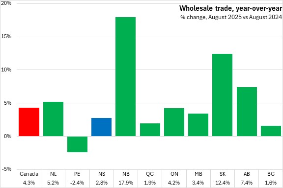Nova Scotia wholesale trade grew 2.8% in August when compared with the same month last year. Canada's wholesale trade grew 4.3%, year-over-year. All provinces except Prince Edward Island reported year-over-year increases in wholesale trade, led by New Brunswick.