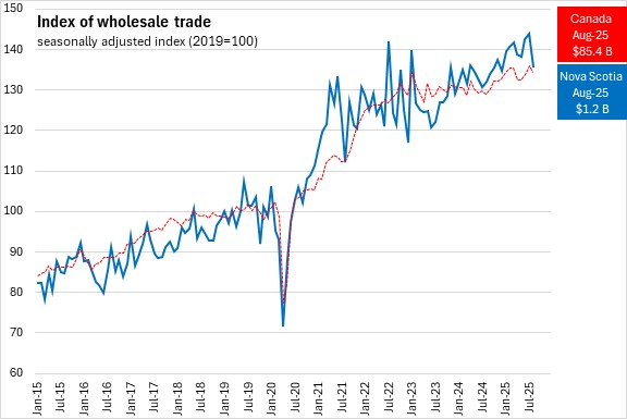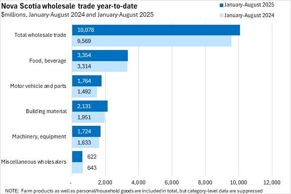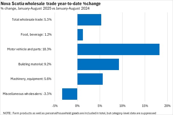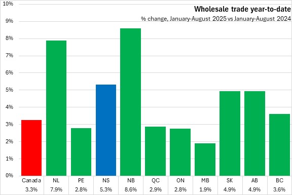 Nova Scotia wholesale trade increased 5.3% in the first eight months of 2025 compared to the same period of 2024. Canada's wholesale trade increased 3.3%. All provinces reported year-to-date increases in wholesale trade. New Brunswick and Newfoundland and Labrador reported the fastest gains, while Manitoba had the slowest.