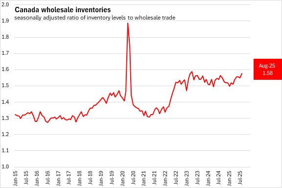 Wholesale inventories as a share of sales have increased in 2025, growing to a value of 1.58 in August 2025.