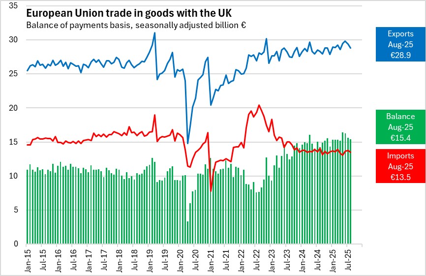 - the European Union surplus in goods trade with the UK narrowed by €216.6 million to €15.4 billion.