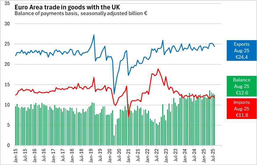 - the Euro Area surplus in goods trade with the UK narrowed by €223.3 million to €12.6 billion.