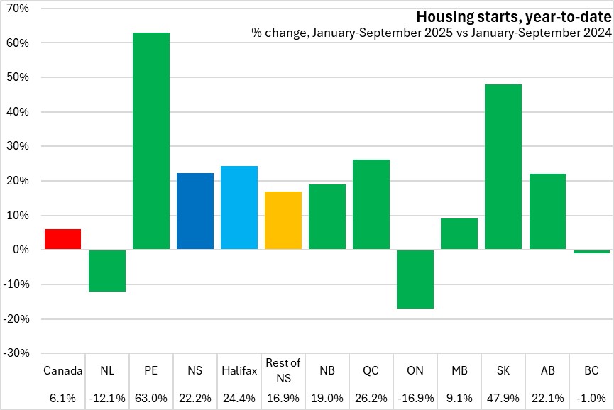 Nova Scotia housing starts rose 22.2% in the first nine months of 2025 compared to the same period a year ago. Halifax housing starts have increased 24.4% in January-September 2025 compared to the same period a year ago, while housing starts in the rest of Nova Scotia rose 16.9%. Nationally, housing starts grew 6.1% in the first nine months of 2025, with gains in all provinces except Newfoundland and Labrador, Ontario and British Columbia. Saskatchewan and Prince Edward Island posted the largest gains while Ontario posted the fastest decline.