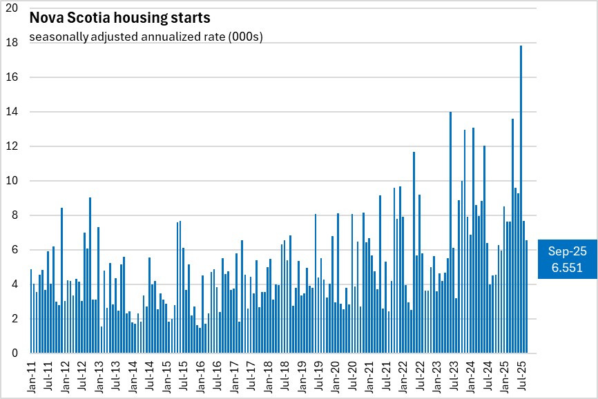 Nova Scotia’s housing starts (seasonally adjusted annualized rate) totalled 6,551 units in September 2025. This was a 14.5% decline from the previous month's revised value of 7,663 starts. July housing starts were the highest in the monthly records that date back to 1990.