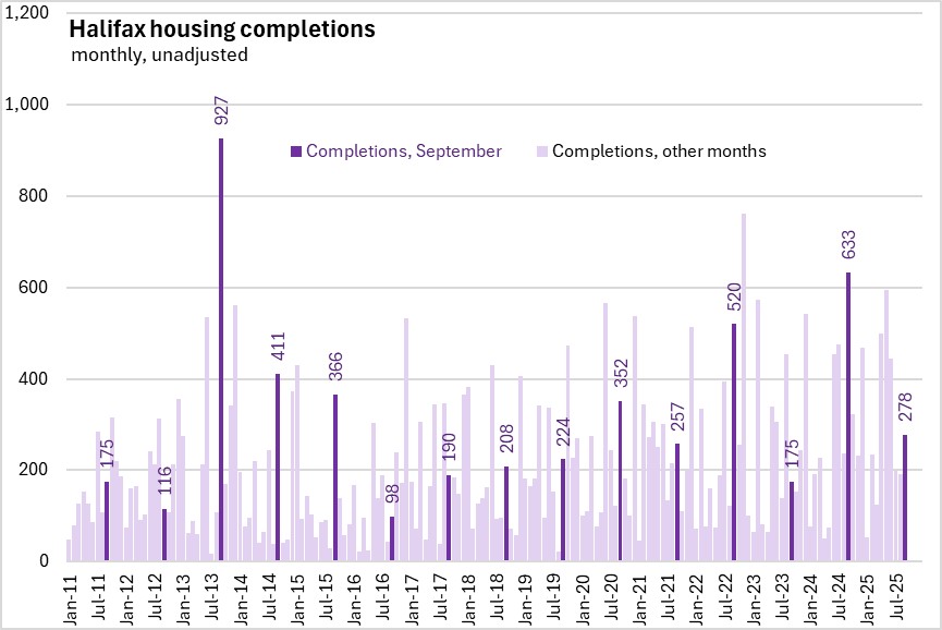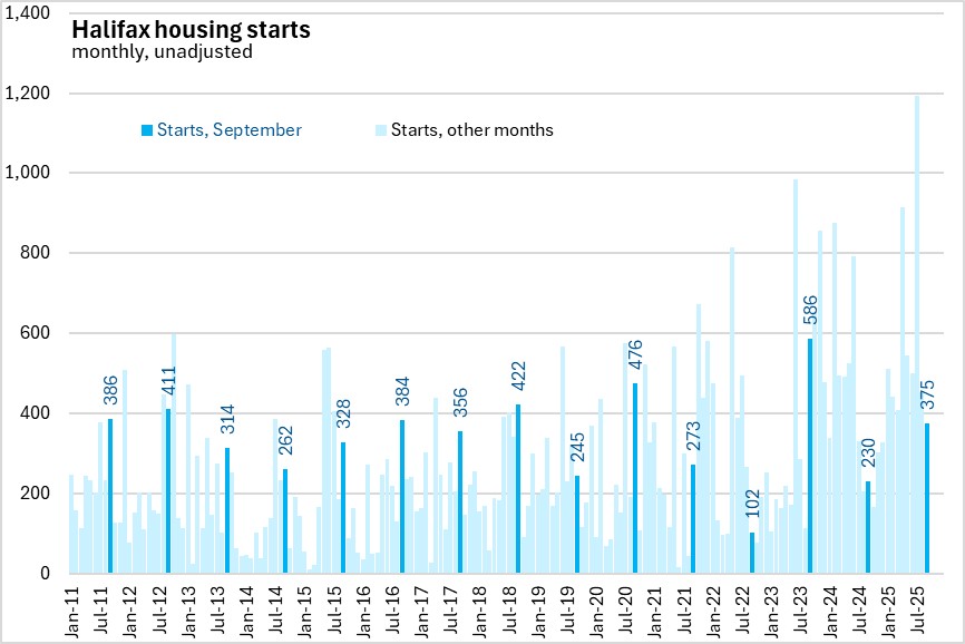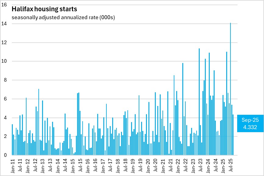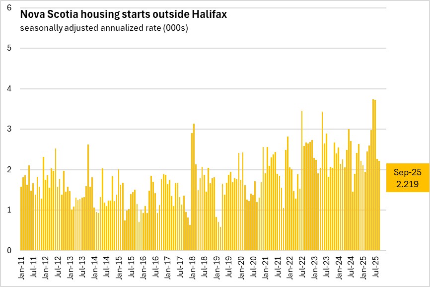 Outside of Halifax, housing starts declined to a seasonally adjusted annualized rate of 2,219 units in September 2025, down 2.1% from 2,267 units in August 2025.
