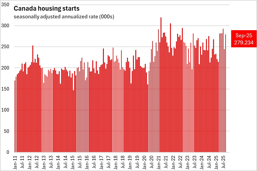 Across Canada, housing starts rebounded to a seasonally adjusted annualized rate of 279,234 units in September 2025, up 14.2% from 244,543 units reported in August 2025.