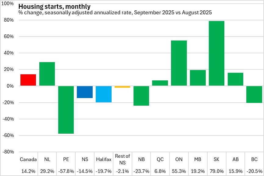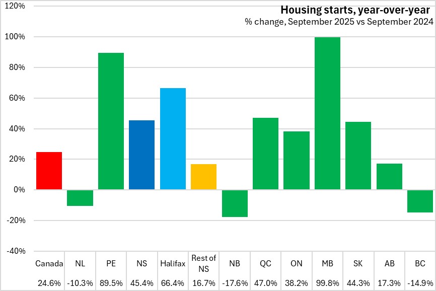 Nova Scotia's housing starts were up 45.4% compared with the 4,505 unit pace set in September 2024. Halifax housing starts were up 66.4% from their rate in September 2024 (2,604). Housing starts outside the city were up 16.7% year-over-year from their pace in September 2024 (1,901). Across Canada, housing starts were up 24.6% year-over-year in September 2025 with gains all provinces except Newfoundland and Labrador, New Brunswick and British Columbia. Prince Edward Island and Manitoba reported the fastest year-over-year gains.