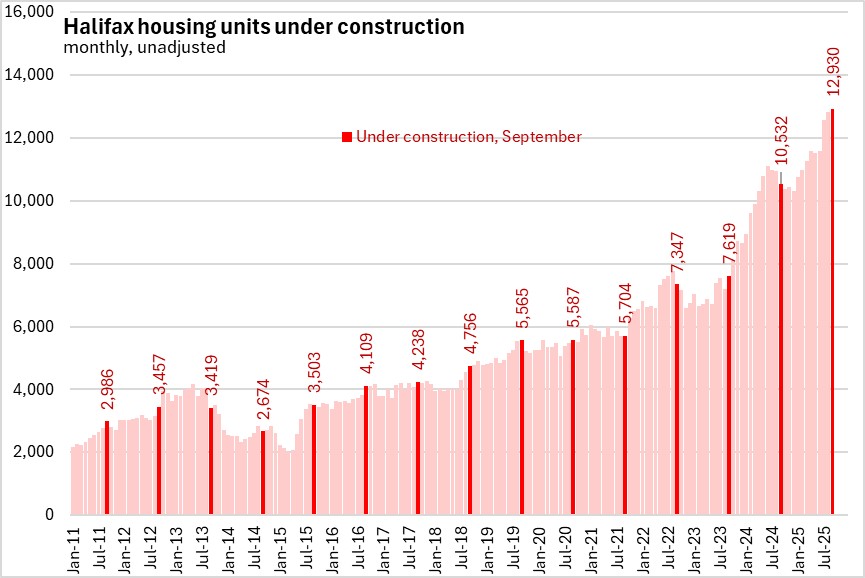In unadjusted results for Halifax in September 2025, there were 375 housing starts and 278 completions. The stock of units under construction rose to 12,930 units in Halifax from the previous month, up 22.8% from units under construction in the same month last year (10,532).
