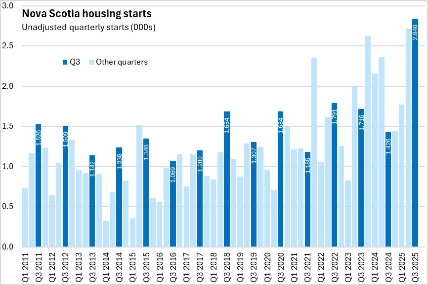 There were a total 2,840 housing starts in Nova Scotia in Q3 2025 - the strongest quarterly pace since 1986. This was almost double (+99.2%) from 1,426 in Q3 of 2024.