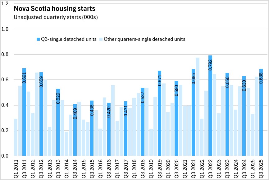 Starts for single detached dwellings rose 9.2% from 630 units in Q3 2024 to 688 units in Q3 2025.