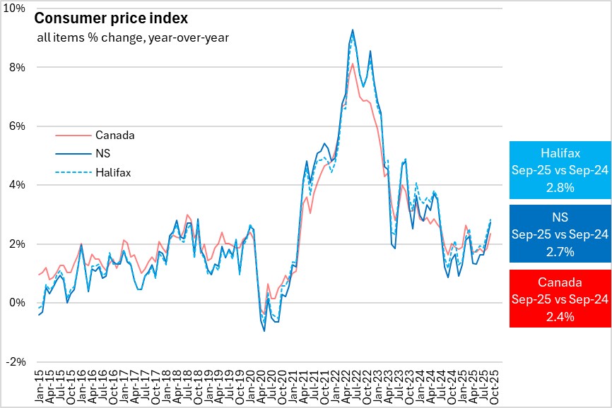 All items: Consumer prices in Nova Scotia increased 2.7%, up 0.5 percentage points from August 2025. The national average inflation was 2.4%. In Halifax consumer prices increased 2.8%.