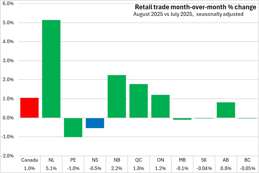 In Nova Scotia retail trade decreased 0.5% to $1.8 billion. Nationally, retail trade increased 1.0% to $70.4 billion. Five provinces reported increases in retail trade, led by Newfoundland and Labrador. Five provinces reported decreases in retail sales, led by Prince Edward Island.