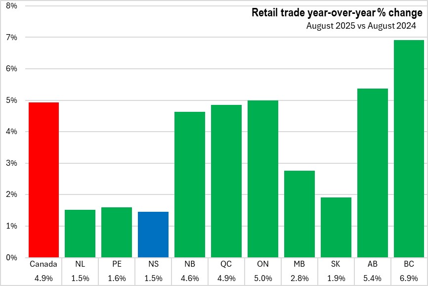 Nova Scotia retail trade increased 1.5% compared to the same month last year. Nationally, retail trade was up 4.9% year-over-year. All provinces reported year-over-year increases in retail trade, led by British Columbia. Nova Scotia and Newfoundland and Labrador reported the slowest growth rate.