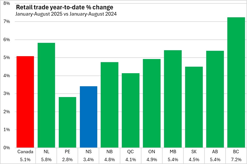 Nova Scotia retail trade increased 3.4% year-to-date compared to the same period last year. Nationally, retail trade was up 4.9% year-to-date. All provinces reported year-to-date increases in retail trade, led by British Columbia. Prince Edward Island reported the slowest growth (followed by Nova Scotia).