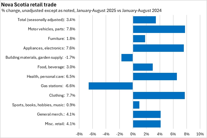 In dollar terms, motor vehicles/parts ($3.956 billion), food/beverage ($2.793 billion), gas stations ($2,025 billion) and general merchandise stores ($1.971 billion) contributed the most to Nova Scotia's retail sales in January-August 2025.