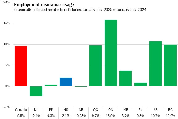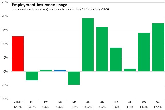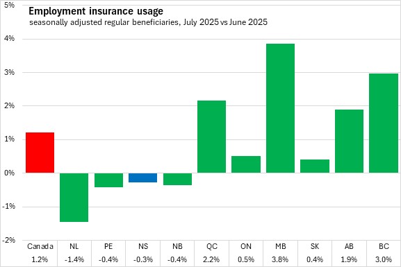 Seven provinces reported higher employment insurance usage in August, led by Alberta and Prince Edward Island. Compared to July 2025, three provinces reported lower employment insurance usage led by Québec.
