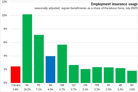 The number of employment insurance beneficiaries amounted to 4.0% of the labour force in Nova Scotia in August 2025. Nationally, the share of beneficiaries was 2.4% of the labour force. Newfoundland and Labrador had the largest share of beneficiaries of the labour force, while British Columbia had the lowest.