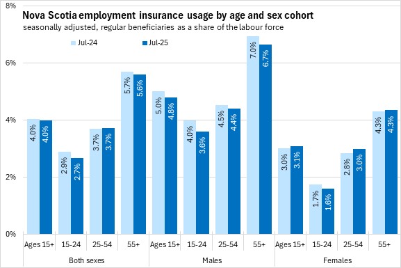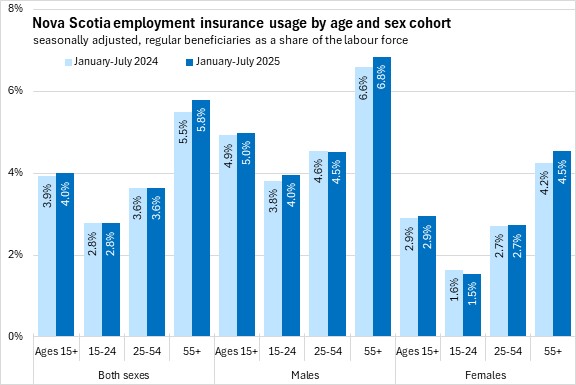 As a share of the labour force, employment insurance usage increased for older workers, and males aged 15-24 in the first eight months of 2025. There was a slight decline in employment insurance usage as a share of the labour force among male core-aged workers and females aged 15-24.